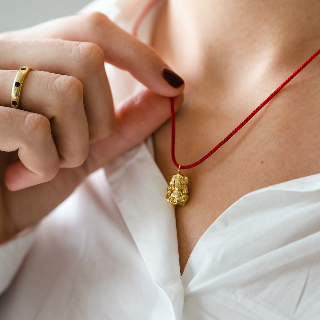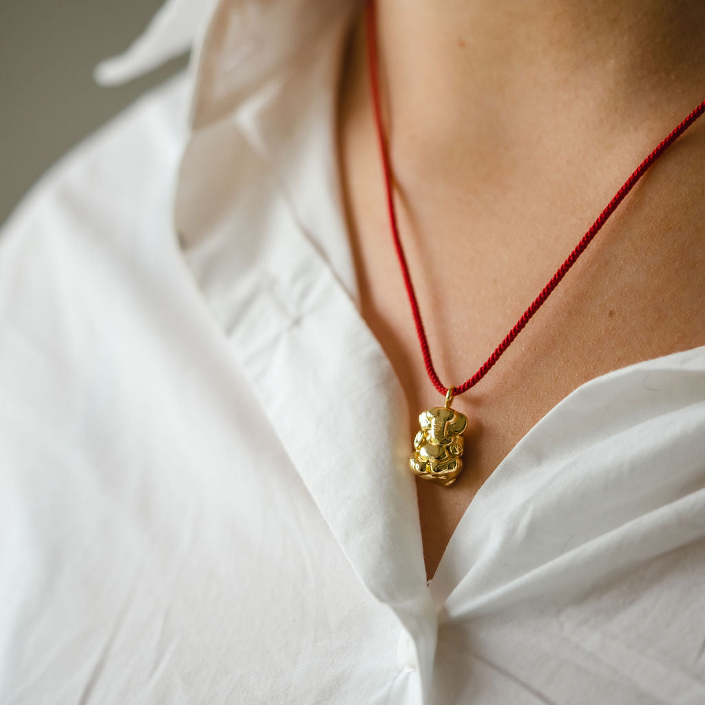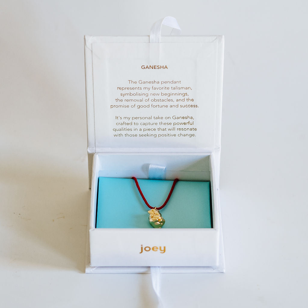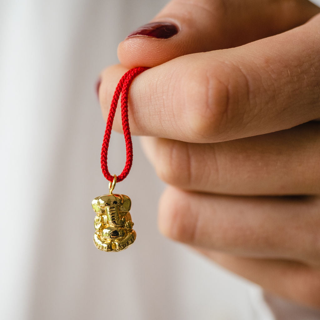 The pendant Its 12mm high & gold plated on a 70cm red japanese silk cord in a box explaining the story of Ganesha.