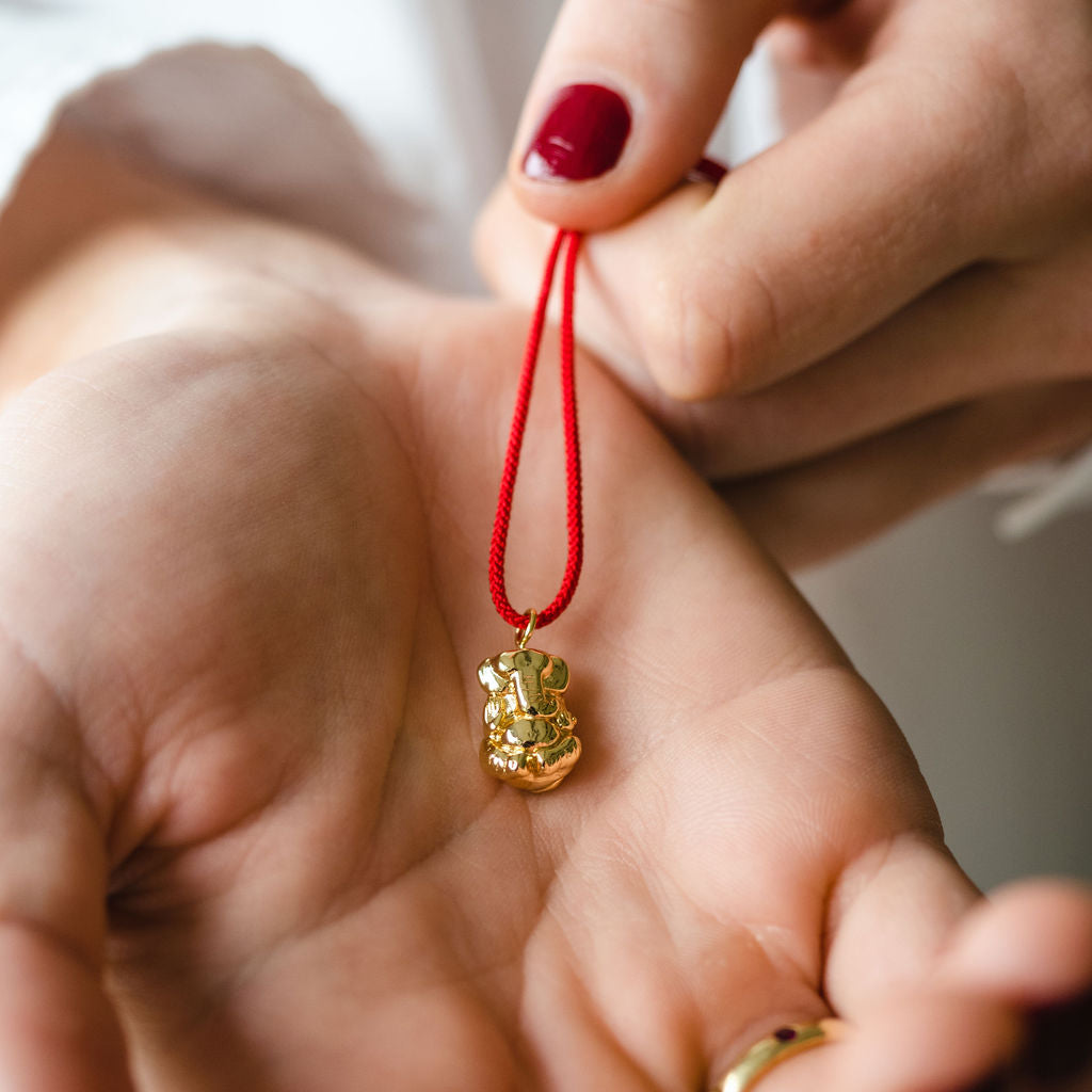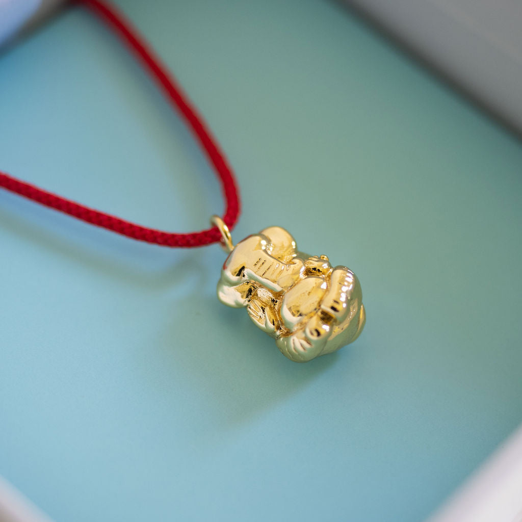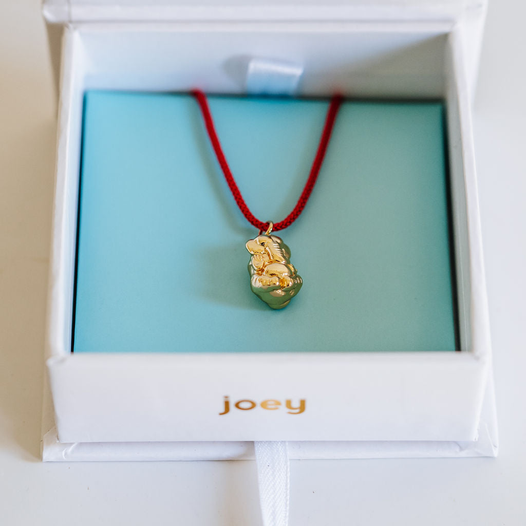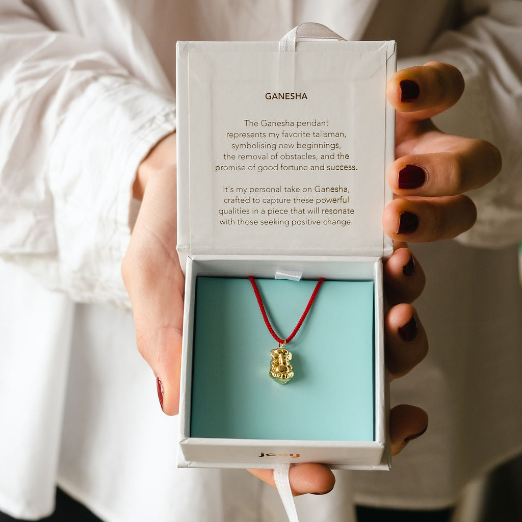 The pendant Its 12mm high & gold plated on a 70cm red japanese silk cord in a box explaining the story of Ganesha.