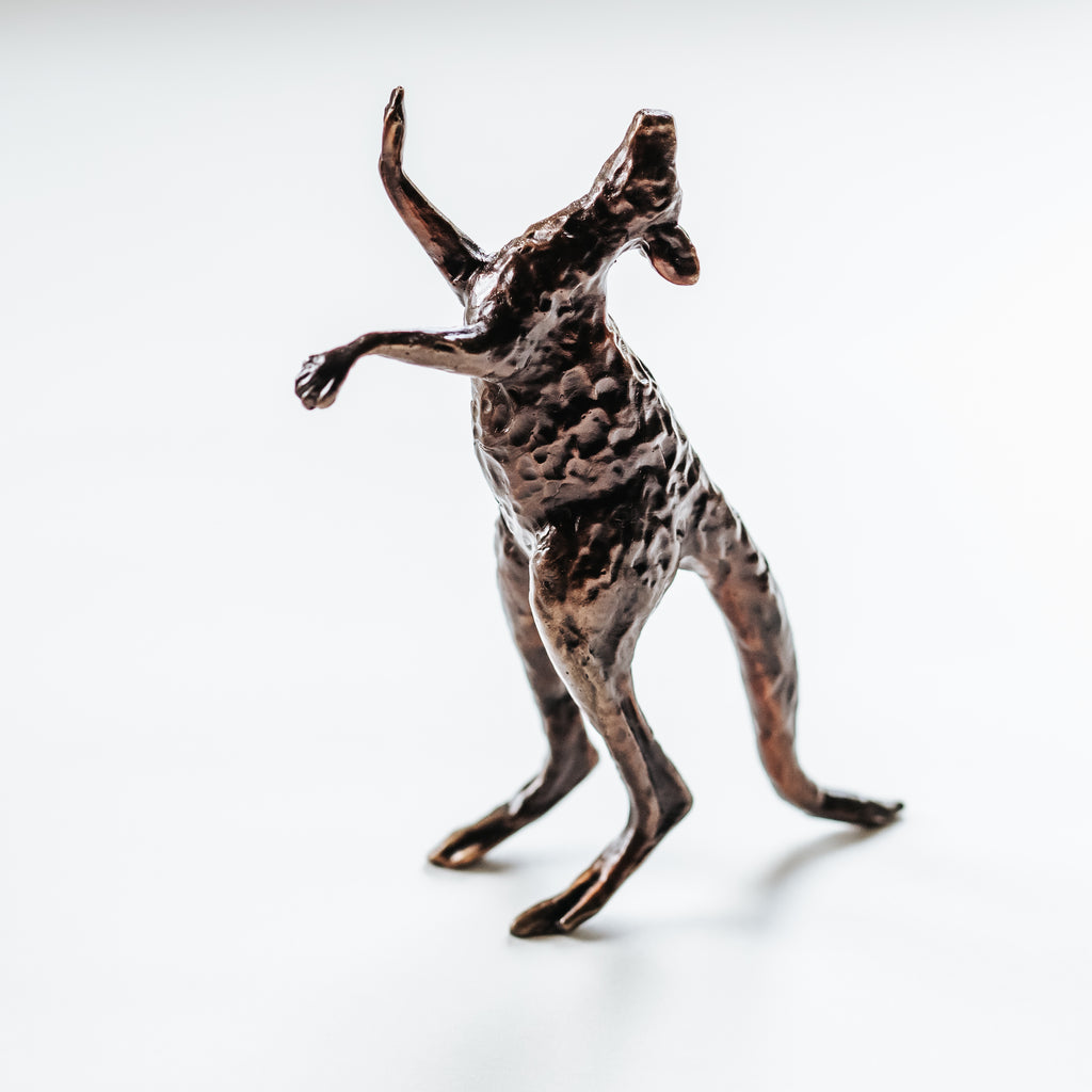 Boxing kangaroo mini sculpture in an upright stance with forepaws raised, crafted in solid bronze.